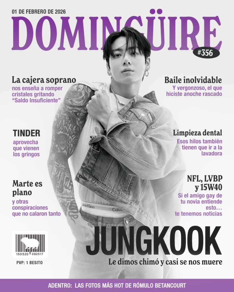 La portada de Domingüire se luce este domingo con la cara de Jungkook, el cantante más importante de la década después de Faraón Love Shady. Por si no sabes quién es, mi querido boomer, este cantante —también conocido por sus amigos como Young Cuck— forma parte de BTS (Bachata Trancada Surcoreana), la boyband surcoreana que sacudió el mundo del espectáculo con el anuncio de su esperadísimo nuevo disco y una gira por Latinoamérica que obviamente ignorará a Venezuela.