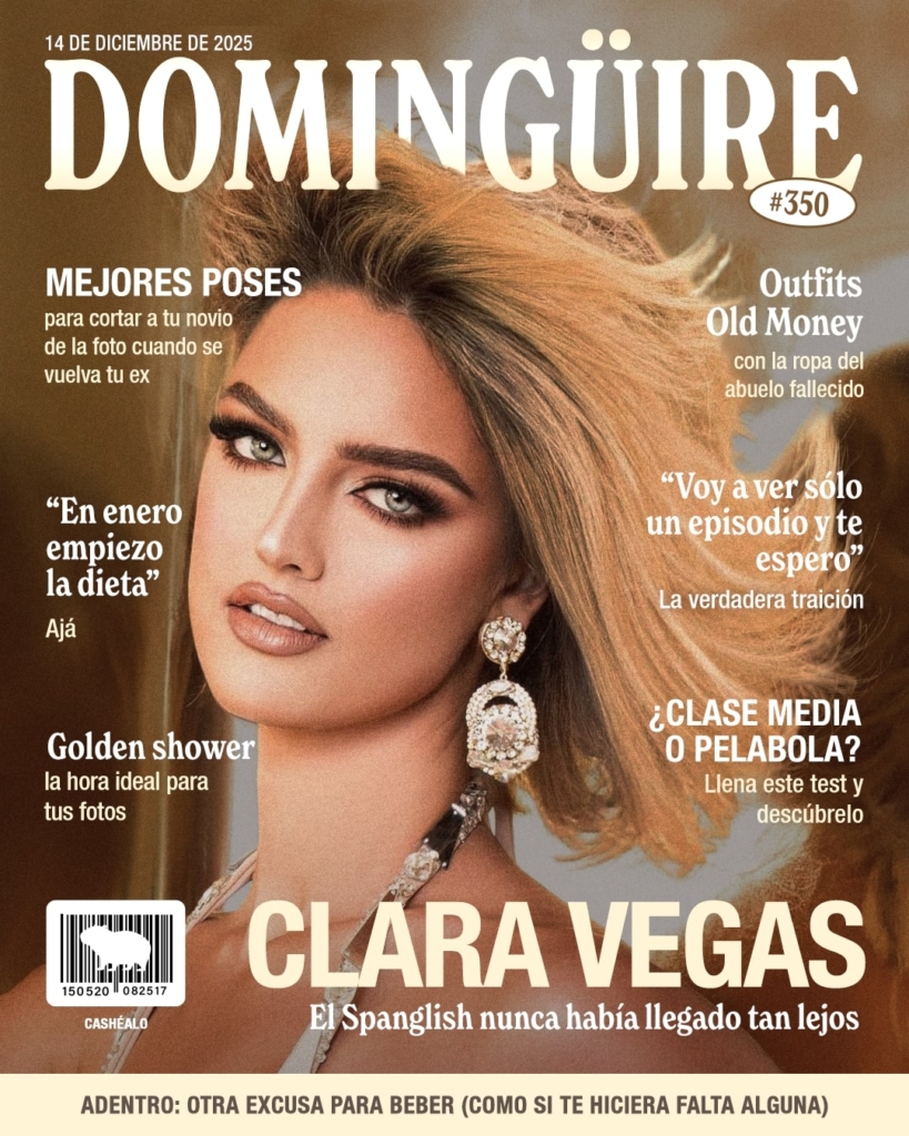 Clara Vegas ya no es solo la Miss Venezuela; ahora también es la reina de Domingüire, la revista que hizo que los kioskeros comenzaran a trabajar los domingos. La flamante miss llega a nuestra portada para desbordarla de encanto, de maquillajes que nuestro pasante jamás podrá pagar y de un spanglish so prominent que sería incapaz de comunicarse en un popular neighborhood. Pero Dominguire no es solo tirar puntas a una miss a ver si nos manda un DM; también te traemos consejos para un photo session de fotos en la golden shower y los mejores outfits old money con olor a viejo muerto. ¡Coño, se nos pegó el Spanglish también!