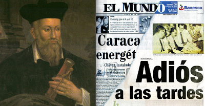 Nostradamus, el célebre vidente del medioevo, sigue dando qué hablar cuando una de sus más discutidas profecías se cumple al pie de la letra: El Mundo (periódico vespertino de circulación nacional) llegó a su fin. Así lo escribió hace más de 500 años: “A la llegada del tercer milenio, en el ocaso vespertino, por falta de anunciantes y bajas ventas, la nación de Hoz verá el fin del Mundo”.