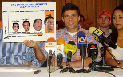 “¡Qué va! Leopoldito no tiene competencia, es buenmozo y además habla muy lindo. Ese Capriles que va, ¿tu no lo viste en las fotos con Chávez? Ese es un enano, yo pensaba que era alto, el otro Vecchio no sé ni quien es. Yo a Leopoldo le daría, fácil.” Rosa Plaza, ama de casa, 67 años.