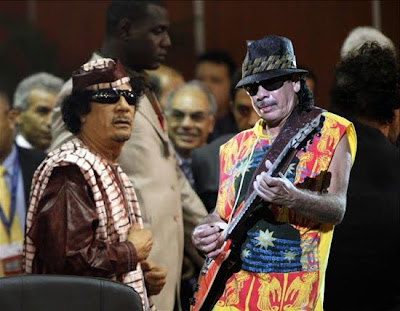 Gadafi sorprendió a todos al anunciar que dejará la presidencia de Libia para dedicarse al espectáculo junto a su alma gemela, Carlos Santana.