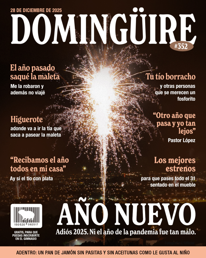 2025 se nos va en un abrir y cerrar de ojos y a pesar de haber sido una porquería de año, le cedemos la portada de Domingüire, la revista más robada en los kioskos de Zaraza. Domingüire cierra el año con broche de latón —lo único que podemos pagar— lleno de los mejores deseos por 2026, un año que esperamos esté lleno de prosperidad, real parejo y buenas celebridades para presumir en esta revista. En esta edición te traemos una lista con todas las cosas que puedes hacer en vez de acompañar a tu tía a dar la vuelta con una maleta y una artículo especial con nuestros tips de primeros auxilios para cuando tu tío borracho se vuele un pie con un cohetón.