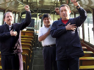 “Yo traje este autobús porque tiene suficientes asientos para que nos sentemos los izquierdistas de Latinoamérica” exclamó el presidente Chávez al llegar a la Habana. “Sin embargo se me quedaron fríos los puestos de la cocina, allá es donde seguro se sentaría Zelaya… hermano Zelaya, te mandamos un saludo valiente, sigue resistiendo. Algún día volverás. El otro día hablaba con Lula y me dijo que ya estaba pensando cobrarte impuestos y todo, que le tienes toda hedionda la embajada, jeje… ¡Ríanse!” dijo el Presidente ante las risas espontáneas de su comitiva.